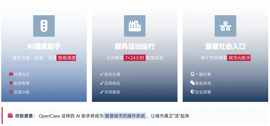 OpenClaw 作为未来城市系统的核心,可实现城市的智能调度与高效运转,核心应用方向包括:城市交通智能优化,通过实时调度减少交通拥堵;城市能源智能调配,提升能源利用效率;7×24 小时智能运转政务办理、应急响应、市民服务等公共服务。其终极愿景是成为智慧城市的操作系统,让城市真正实现智能化、自主化运转。