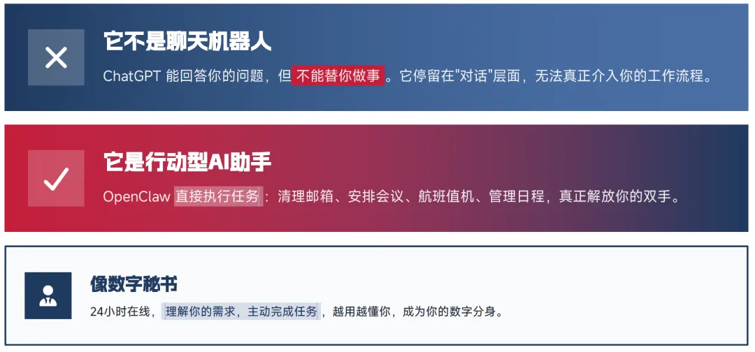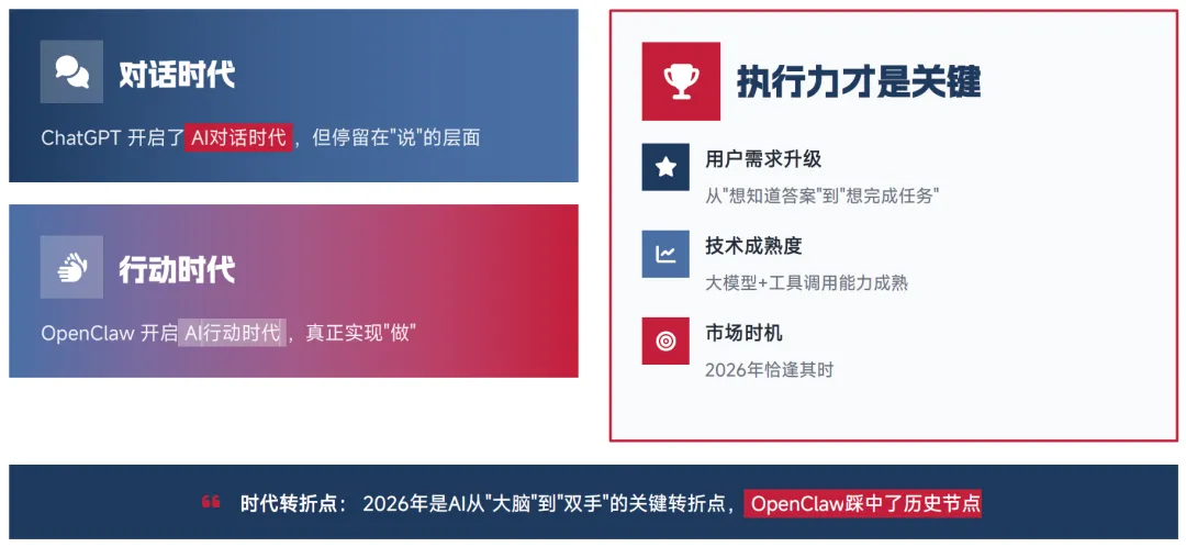 AI 对话时代(ChatGPT)开启了 "会说话" 的阶段,但始终停留在 "说" 的层面,无法为用户完成实际执行;而 OpenClaw 开启了 AI 行动时代,真正实现了从 "说" 到 "做" 的跨越。2026 年,用户对 AI 的核心需求已从 "想知道答案" 升级到 "想完成任务",执行力成为 AI 产品的核心竞争力,OpenClaw 的出现恰逢其时,成为 AI 从 "大脑" 到 "双手" 进化的关键转折点。