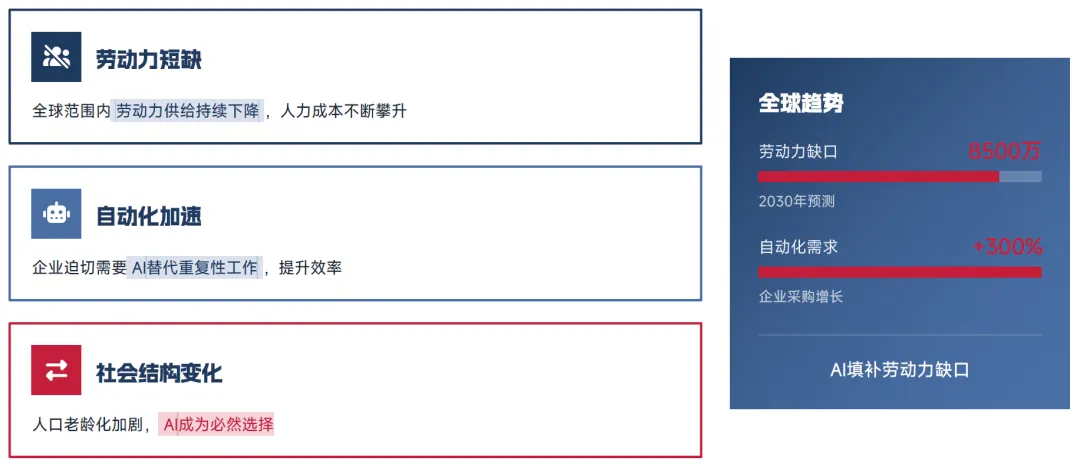 全球劳动力供给持续下降,人力成本不断攀升,人口老龄化问题持续加剧,AI 自动化成为企业应对劳动力缺口的必然选择。数据显示,全球劳动力缺口已达 8500 万,2030 年自动化需求预测增长 300%,企业迫切需要通过 AI 替代重复性工作,提升运营效率,OpenClaw 的出现精准填补了这一市场空白。