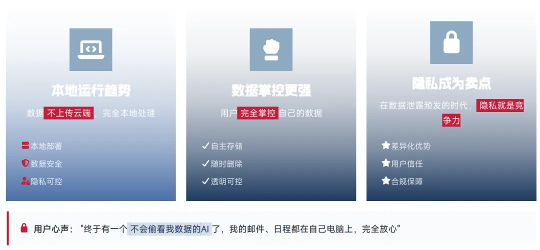 数据不上传云端、完全本地处理,已成为用户选择 AI 助手的核心考量因素。本地部署模式可实现数据安全、隐私可控、用户对数据的完全掌控,隐私保护已成为 AI 产品的核心差异化卖点。大量用户反馈表示,"终于有一个不会偷看我数据的 AI 了,我的邮件、日程都在自己电脑上,完全放心",OpenClaw 的本地优先架构,完美契合了用户对隐私保护的核心需求。