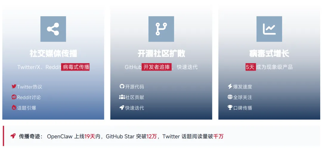OpenClaw 在 Twitter/X、Reddit 等全球社交媒体平台实现了病毒式传播,同时在 GitHub 开发者社区获得了疯狂追捧,形成了极强的传播效应。数据显示,项目上线 19 天内,GitHub Star 数量便突破 12 万,Twitter 相关话题阅读量破千万。通过社交媒体引爆热度、开源社区实现用户扩散、全球开发者推动产品快速迭代,形成了完整的病毒式增长闭环。