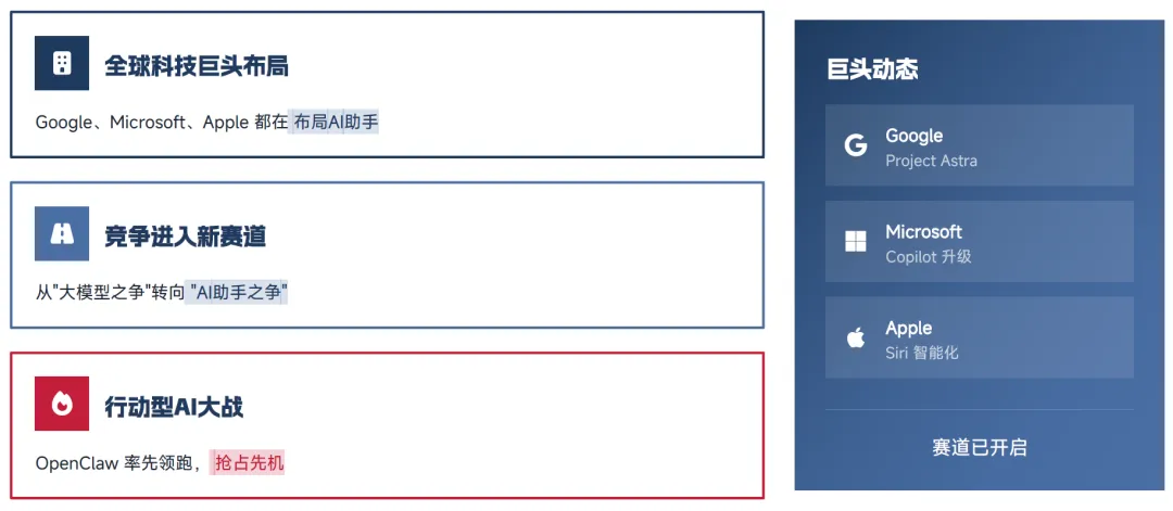 Google、Microsoft、Apple 等全球科技巨头均已全面布局 AI 助手赛道,行业竞争已从 "大模型之争" 转向 "AI 助手之争"。其中,Google 发布 Project Astra、Microsoft 完成 Copilot 全面升级、Apple 推进 Siri 智能化改造,巨头的布局让 AI 助手赛道成为行业焦点,而 OpenClaw 凭借开源、开放的模式率先领跑,抢占了行业发展先机。