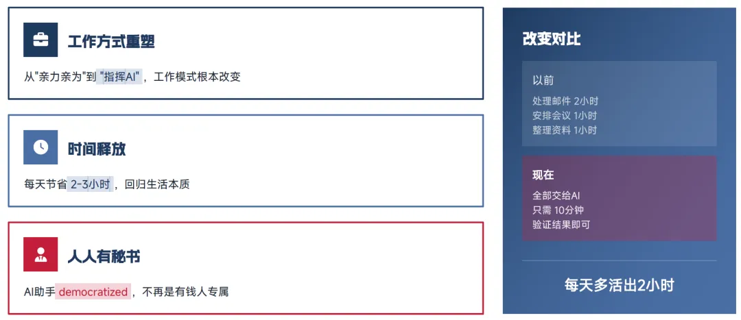 OpenClaw 作为职场秘书,可实现任务自动整理、邮件跟进、会议全流程管理,构建完整的高效工作流程。具体能力包括:从邮件、消息、会议记录中自动提取任务,生成优先级清单,智能分配时间;追踪待回复邮件,自动提醒跟进,甚至代写回复草稿;提前准备会议资料,智能提醒日程,会后自动整理纪要。其典型工作流为:早晨自动总结今日任务→会议前 15 分钟提醒→会后自动发送纪要→下班前汇报完成情况,可帮助用户每天节省 2-3 小时,实现工作效率的显著提升。