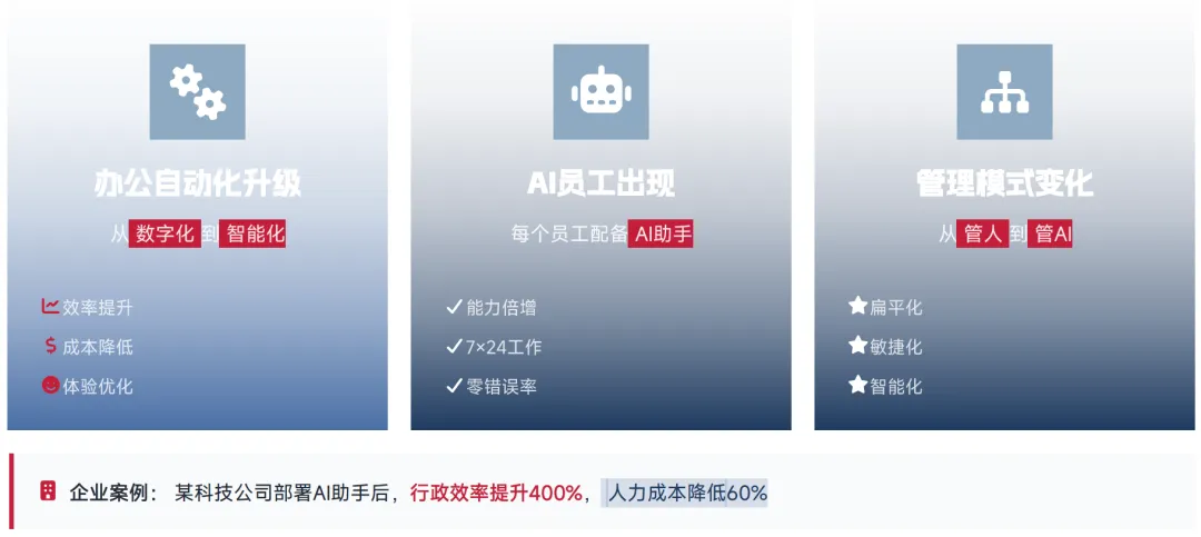 OpenClaw 作为企业办公自动化核心,实现了 AI 员工的雏形落地,核心能力包括:实现报销、审批、报告生成等办公流程的全自动化;通过标准化流程的自动化执行,实现人均产出提升 3-5 倍,重新定义企业工作效率。具体企业应用场景包括:智能报销,自动整理票据、填写报销表单;数据报告,自动生成业务周报、月报;客户管理,自动跟进客户线索、智能推荐跟进策略。真实企业案例显示,某科技公司部署基于 OpenClaw 的 AI 助手后,行政效率提升 400%,人力成本降低 60%。