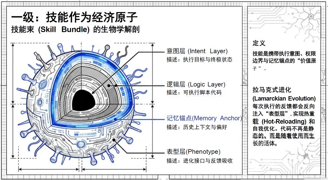 同时,系统实现了拉马克式的进化能力,每一次任务执行的反馈都会反向注入技能的表型层,实现代码的热重载与自我优化,让静态的代码转变为随着用户使用持续生长的活体功能,使用频次越高、场景越丰富,系统对用户需求的适配能力就越强。