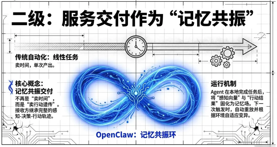 第二级变现体系是服务交付作为 “记忆共振”,打破了传统自动化 “卖时间、单次产出” 的模式,转变为 “卖行动遗传” 的全新服务模式。Agent 在本地完成任务后,将 “感知向量” 与 “行动结果” 固化为记忆场,后续触发同类任务时,可自动重放并根据环境自适应调整,服务接收方可直接继承完整的感知 - 决策 - 行动轨迹,大幅降低服务交付的边际成本。在此基础上,还衍生出流水线交付、OaaS 主权分身、垂直共生体等高级服务形态,实现服务能力的无限复制与规模化扩张。