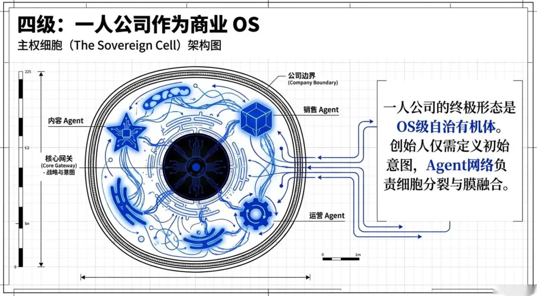 第四级变现体系是一人公司作为商业 OS,其终极形态是 OS 级的自治有机体,创始人仅需定义初始意图,Agent 网络即可自主完成销售、内容、运营等全环节工作,形成内容自治帝国、服务工厂、产品有机体等多种商业形态,基于 “租赁分身实例” 的模式实现无限水平扩展,无需增加人力成本即可实现营收的规模化增长。