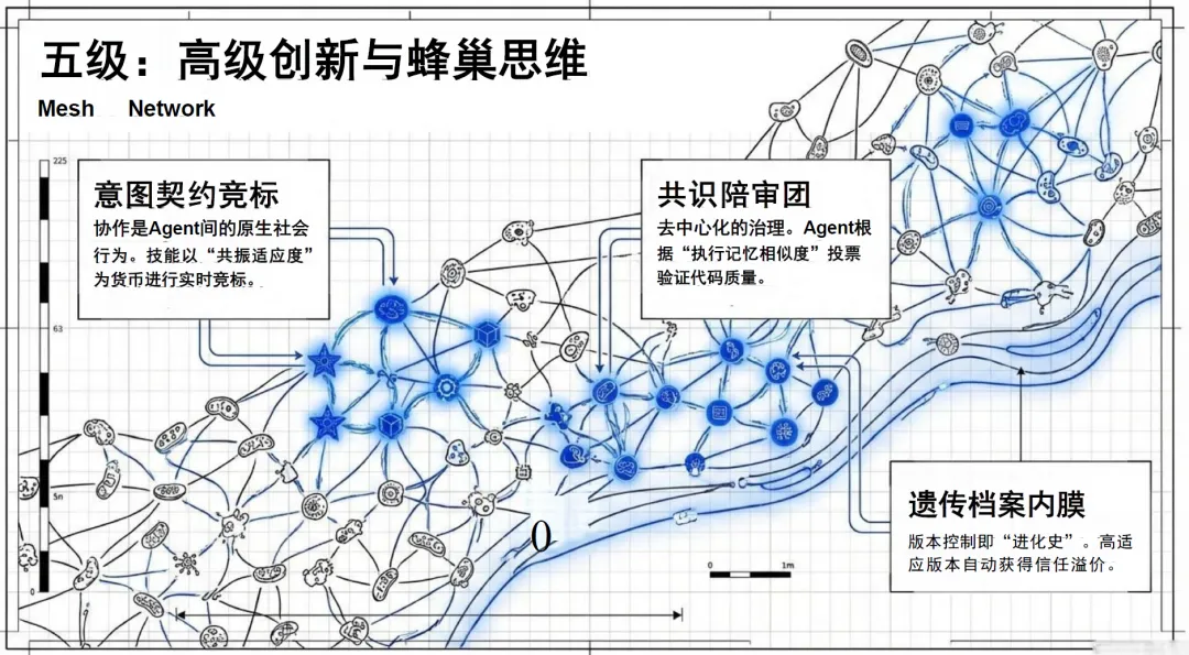 第五级变现体系是高级创新与蜂巢思维,构建了多 Agent 的 Mesh 网络协作体系,Agent 间以 “共振适应度” 为货币进行意图契约的实时竞标,通过去中心化的治理模式完成代码质量验证与协作分工,形成了群体智能的蜂巢思维模式,实现高难度创新任务的协同攻坚与商业化落地。