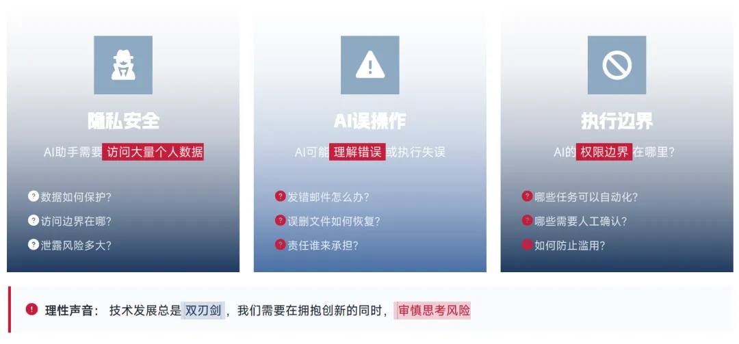 除了上述核心风险外,OpenClaw 还面临着操作执行与伦理层面的多重挑战。在操作风险层面,AI 可能出现理解错误或执行失误,比如发错邮件、误删文件、错误执行系统命令等情况,一旦出现此类问题,数据与系统的恢复难度、责任归属的界定,都是亟待解决的难题。