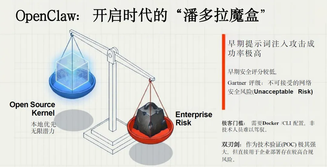 安全风险是 OpenClaw 发展面临的首要挑战,其原生的系统级权限开放模式,在带来强执行能力的同时,也放大了安全隐患。从技术层面来看,项目早期版本的提示词注入攻击成功率极高,Gartner 对其安全评级为不可接受的网络安全风险,未经审核的外部技能与组件,可能导致用户数据外流、凭证窃取、系统被恶意控制等严重安全事件,而 “安装即完全信任” 的模式,让普通用户难以识别潜在的恶意代码,安全风险的覆盖面极广。