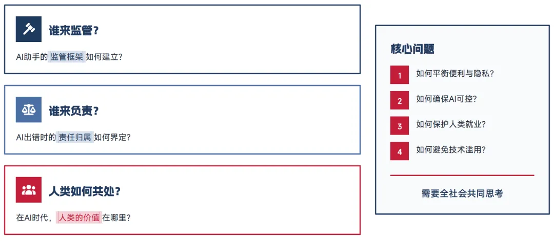 在伦理边界层面,AI 的权限边界尚未形成统一的行业标准,哪些任务可以完全自动化执行、哪些任务必须经过人工确认、如何防止技术被滥用,都需要建立明确的伦理边界和使用规范。同时,随着 AI 代理逐步替代人类完成大量工作,人类在 AI 时代的核心价值定位、如何确保人类在 AI 辅助下保持核心创造力与主观能动性,也成为全社会需要共同思考的问题。