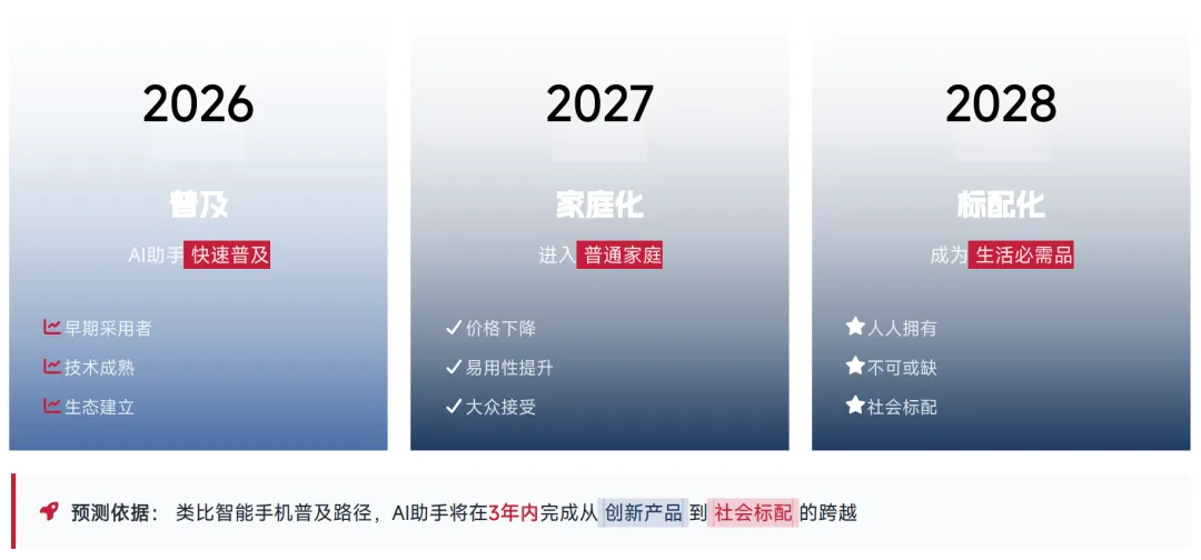 2026 年为普及之年,AI 助手将实现快速普及,完成早期用户渗透、核心技术成熟与完整生态建立,成为技术爱好者、职场人、创业者群体的标配工具;