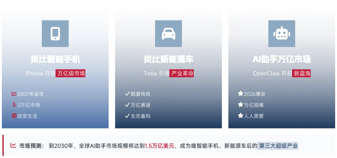 从整体市场规模来看,类比智能手机 iPhone 开创的 3 万亿级市场,AI 助手将开启全新的万亿级蓝海市场。OpenClaw 所开启的行动型 AI 赛道,预计到 2030 年全球市场规模将达 1.5 万亿美元,成为继智能手机、新能源车后的第三大超级产业。