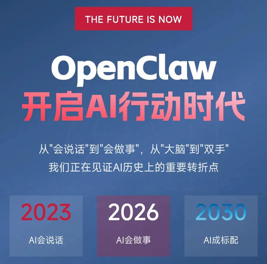 OpenClaw 不是终点,而是 AI 发展全新时代的起点。它代表了 AI 从 "大脑" 到 "双手" 的关键进化,是 AI 从对话工具向执行助手的重大跃迁,实现了 AI 从 "会说话" 到 "会做事" 的历史性转折。2023 年 AI 实现了 "会说话" 的突破,2026 年 OpenClaw 开启了 AI"会做事" 的全新时代,而到 2030 年,AI 助手将成为全社会的标配。