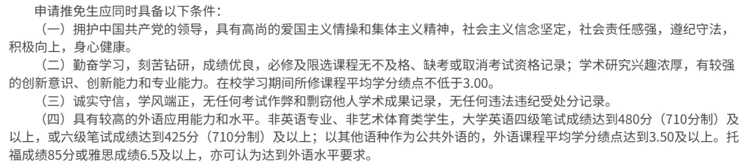 非英语专业、非艺术体育类学生,大学英语四级笔试成绩达到480分及以上,或六级笔试成绩达到425分及以上;以其他语种作为公共外语的,外语课程平均学分绩点达到3.50及以上。托福成绩85分或雅思成绩6.5及以上,亦可认为达到外语水平要求。