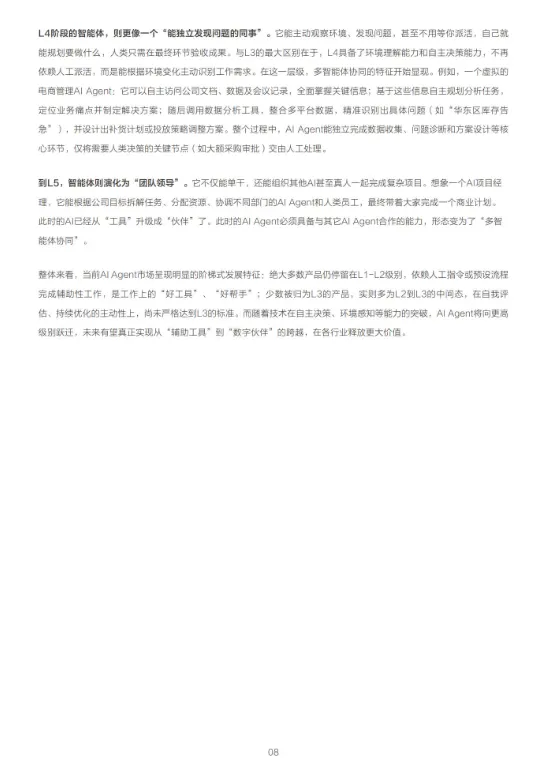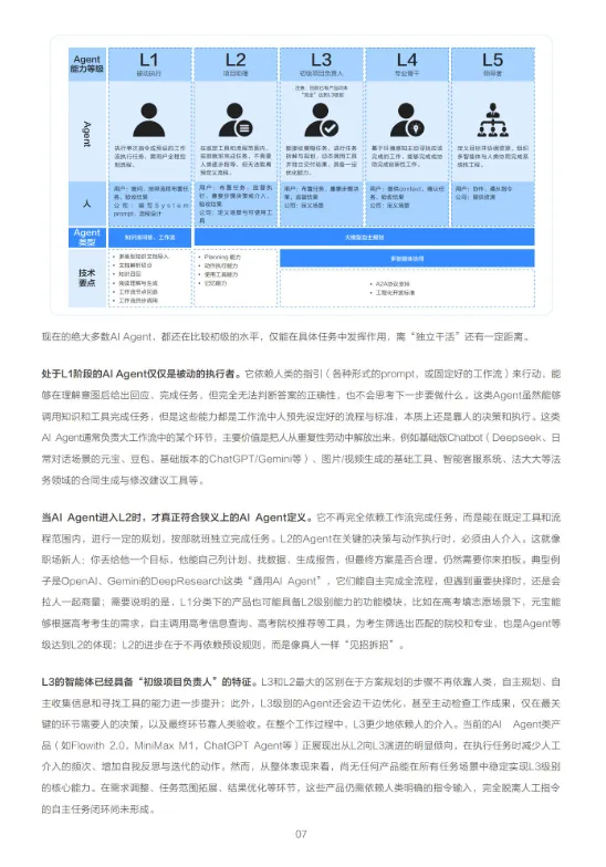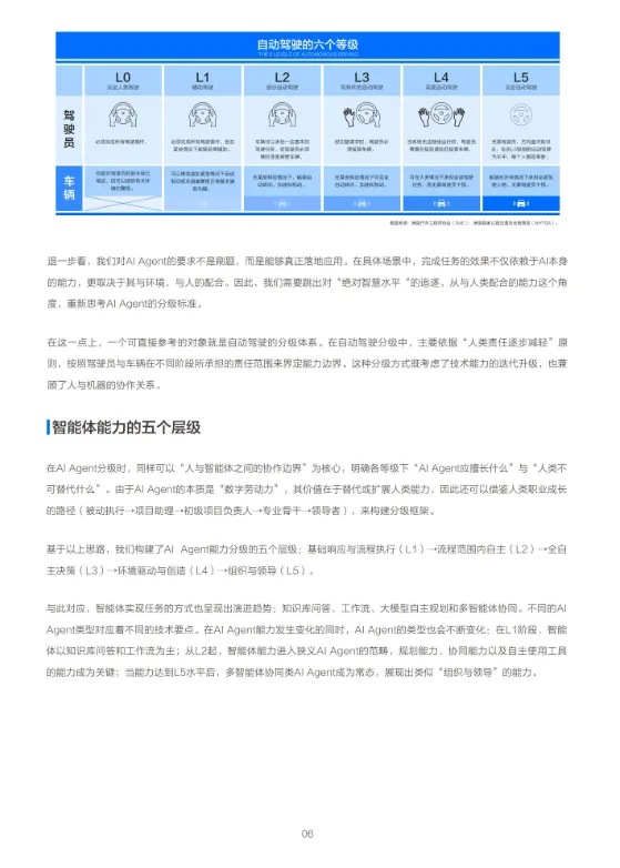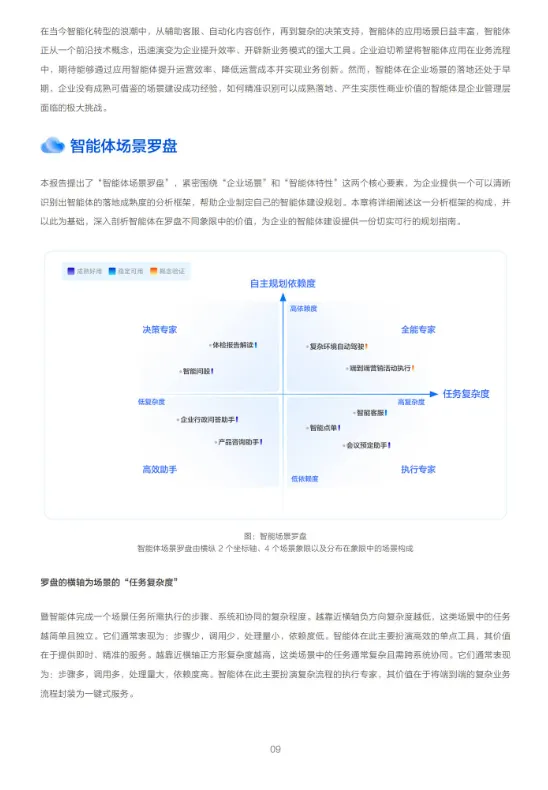 智能体分狭义与广义,核心评判标准是 “行动能力”,可分为 L1 至 L5 五个能力层级,目前多数产品处于 L1-L2 初级阶段。基于 “任务复杂度” 和 “自主规划依赖度” 构建的场景罗盘,将应用分为四大象限,助力企业精准落地。