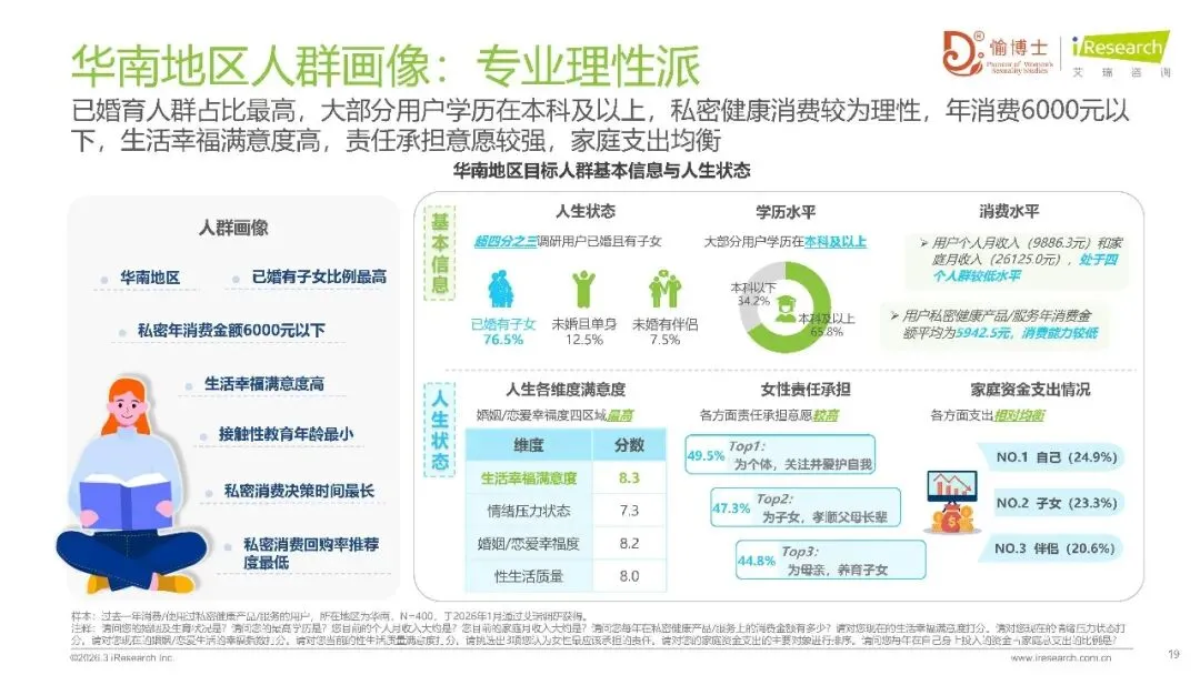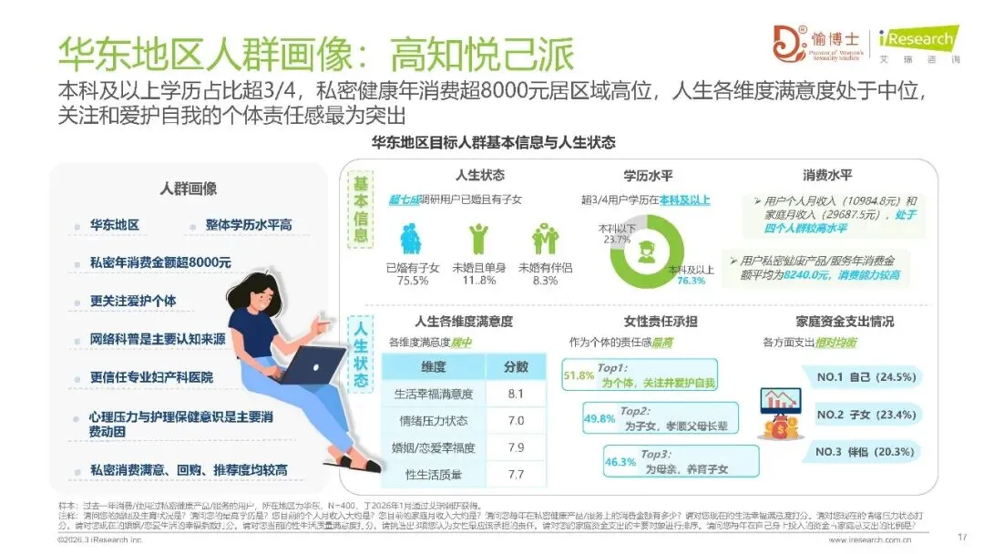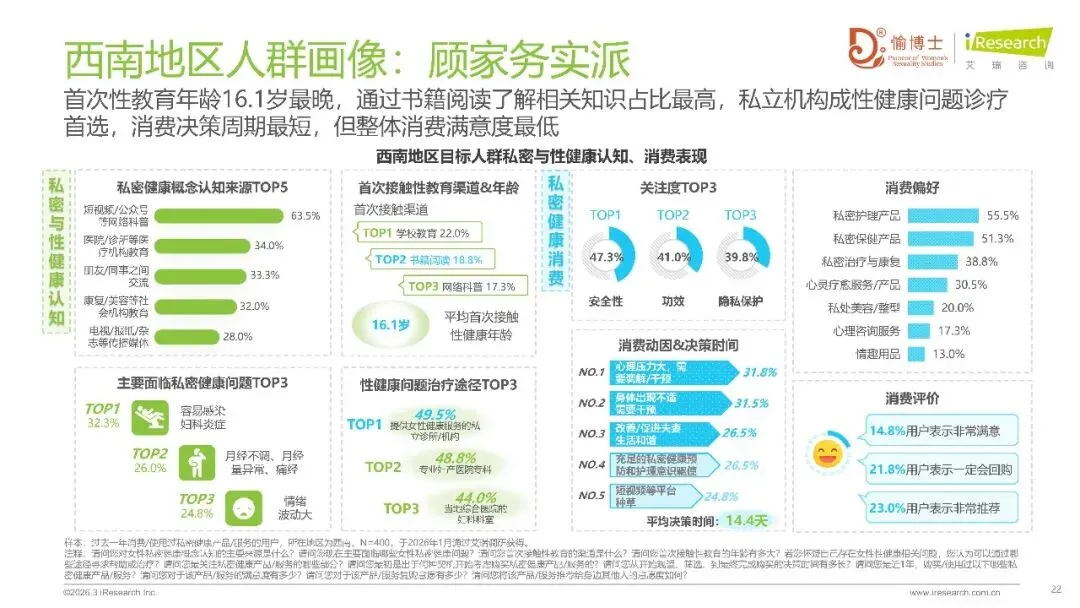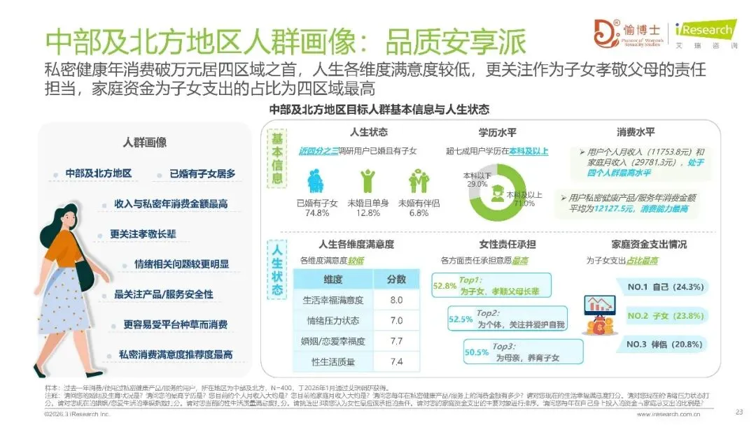 在消费决策的不断演变进程里,女性自我意识的觉醒得以被揭示出来。有78.1%受到访问的女性主导着家庭支出,她们自身消费的优先级,从2025年时处于第三位直接跨越提升到了首位。在私密健康消费领域当中,安全性凭借56%的占比成为了首要的考量因素,年均消费大致集中在1000元至5000元的范围之内,然而地区之间的分化十分明显:华东地区超过8240元,中部地区以及北方地区突破了12000元,华南地区和西南地区则更加趋向于理性。有着高满意度(85.4%),还有强复购意愿(80.7%),这二者印证了市场粘性,心理压力大成为超三成消费者的首要动因,消费者的需求已经从生理护理延伸至身心协同管理。
