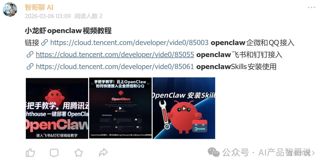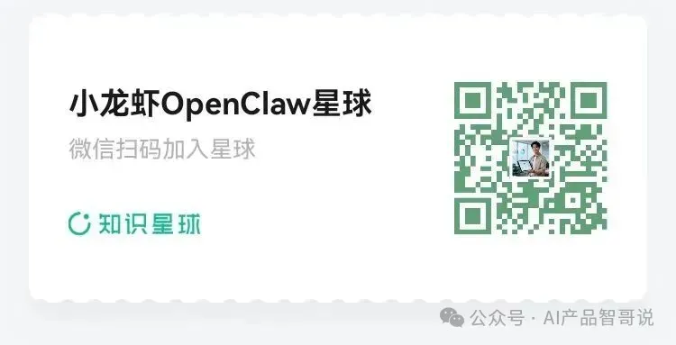 关注我,获取更多AI产品&智能体实战与案例。点击右上角"...",设为星标,不错过每一篇干货。长按扫码加入VIP社群【AI·小龙虾OPenClaw】知识星球,获取本文所有及更多关于AI、小龙虾、智能体等专业内容,有任何问题随时后台与我沟通✅ 独家干货:OpenClaw 最新安装部署、高级用法教程、指令模板,新手直接套用;✅ 问题答疑:我们会一对一解答你安装、使用中的所有问题,避免你卡壳;✅ 实战案例:各行各业的OpenClaw落地案例(职场、自媒体、开发等),帮你打开思路,自己抄作业;✅ 资源共享:星球内成员共享API Key获取技巧、工具集成方法,互利共赢;✅ 打破信息差:后续OpenClaw更新、新功能上线,我会第一时间在星球内分享教程与案例。更重要的是,现在很优惠,现在加入性价比极高,Agent时代已来,别再错过风口!1、后台回复“2026”获取2026最新AI、智能体学习资料包。2、后台回复“面试题”获取AI大模型与产品技术与经理最新大厂面经。3、后台回复“加群”拉你进AI智能体与产品经理行业交流沟通群。关注我们,获取更多AI技术干货与职业成长指南与资料!你在工作中,最想让OPenClaw帮你完成什么任务?觉得这篇文章有用,麻烦点赞、在看、转发三连,让更多人抓住Agent时代的风口~