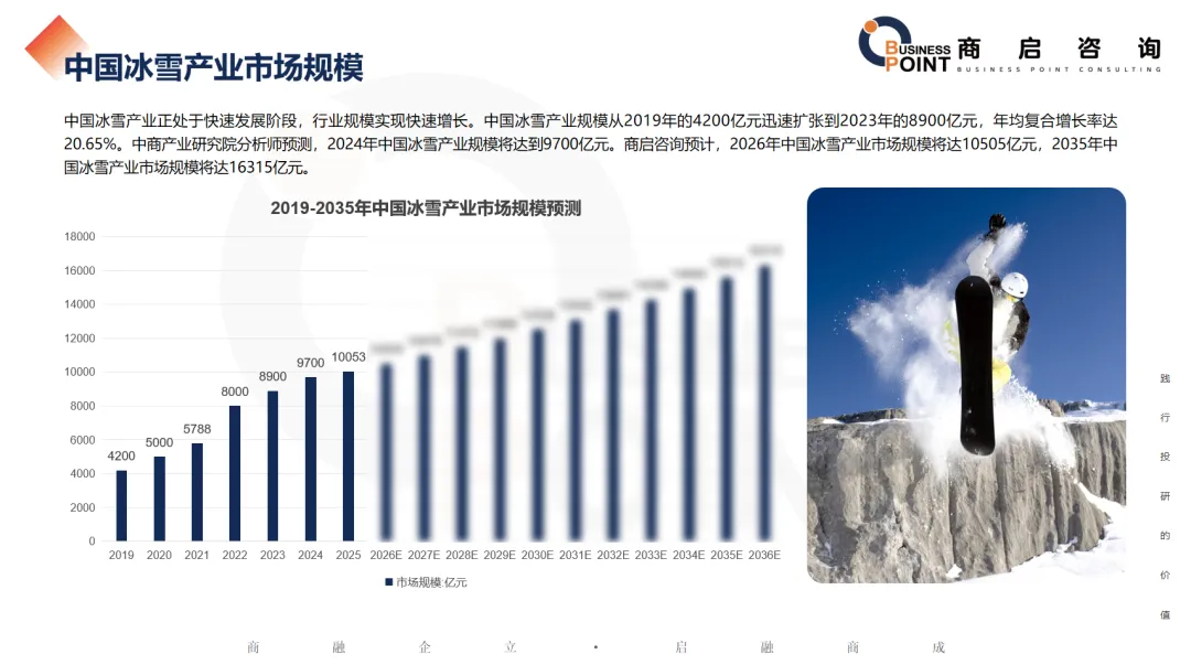 中国冰雪产业正处于快速发展阶段,行业规模实现快速增长。中国冰雪产业规模从2019年的4200亿元迅速扩张到2023年的8900亿元,年均复合增长率达20.65%。中商产业研究院分析师预测,2024年中国冰雪产业规模将达到9700亿元。商启咨询预计,2026年中国冰雪产业市场规模将达10505亿元,2035年中国冰雪产业市场规模将达16315亿元。