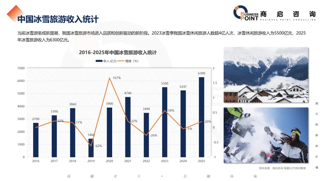 当前冰雪游渐成新国潮,我国冰雪旅游市场进入品质和创新驱动的新阶段。2023冰雪季我国冰雪休闲旅游人数超4亿人次,冰雪休闲旅游收入为5500亿元,2025年冰雪旅游收入为6300亿元。