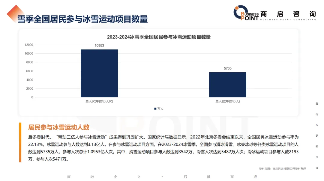 后冬奥时代,“带动三亿人参与冰雪运动”成果得到巩固扩大。国家统计局数据显示,2022年北京冬奥会结束以来,全国居民冰雪运动参与率为22.13%,冰雪运动参与人数达到3.13亿人。在参与冰雪运动项目方面,在2023-2024冰雪季,全国参与滑冰滑雪、冰壶冰球等各类冰雪运动项目的人数达到5735万人,参与人次总计1.0953亿人次。其中,滑雪运动项目参与人数达到3542万,滑雪人次达到5482万人次;滑冰运动项目参与人数2193万,参与人次5471万。