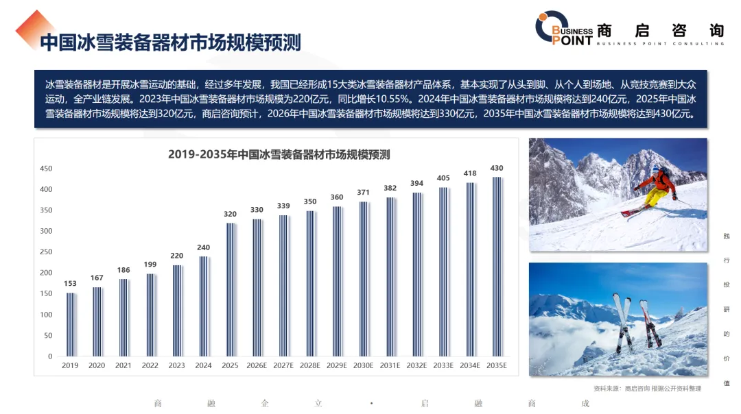 冰雪装备器材是开展冰雪运动的基础,经过多年发展,我国已经形成15大类冰雪装备器材产品体系,基本实现了从头到脚、从个人到场地、从竞技竞赛到大众运动,全产业链发展。2023年中国冰雪装备器材市场规模为220亿元,同比增长10.55%。2024年中国冰雪装备器材市场规模将达到240亿元,2025年中国冰雪装备器材市场规模将达到320亿元,商启咨询预计,2026年中国冰雪装备器材市场规模将达到330亿元,2035年中国冰雪装备器材市场规模将达到430亿元。