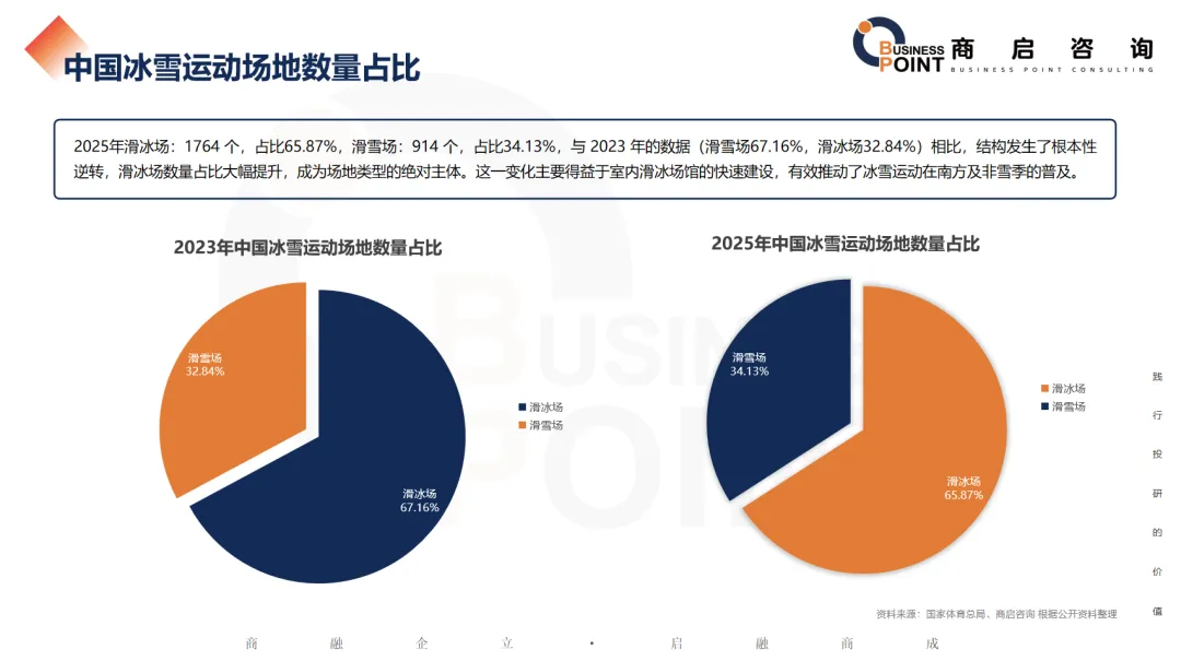 2025年滑冰场:1764 个,占比65.87%,滑雪场:914 个,占比34.13%,与 2023 年的数据(滑雪场67.16%,滑冰场32.84%)相比,结构发生了根本性逆转,滑冰场数量占比大幅提升,成为场地类型的绝对主体。这一变化主要得益于室内滑冰场馆的快速建设,有效推动了冰雪运动在南方及非雪季的普及。