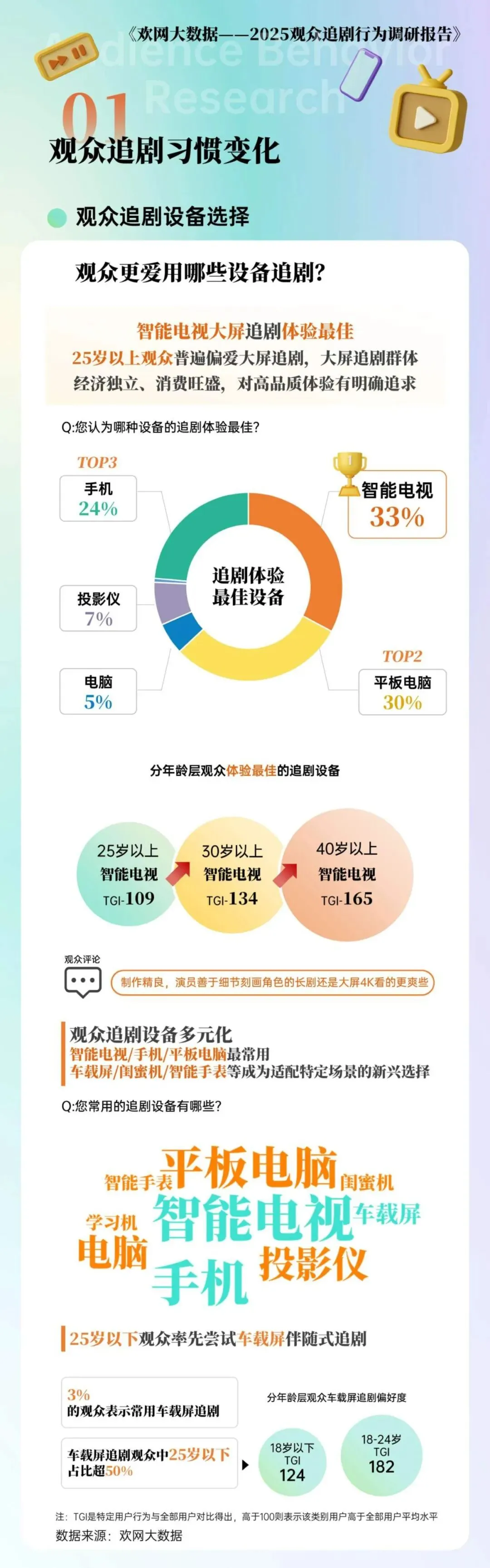 设备的多元化正在成为新趋势。智能电视、手机、平板电脑依旧是观众最常用的追剧设备,车载屏、闺蜜机、智能手表等,也成了适配特定场景的新兴选择。3% 的观众表示会常用车载屏追剧,这其中 25 岁以下的观众占比超过半数,通勤路上的碎片时间,被他们用伴随式追剧填满。