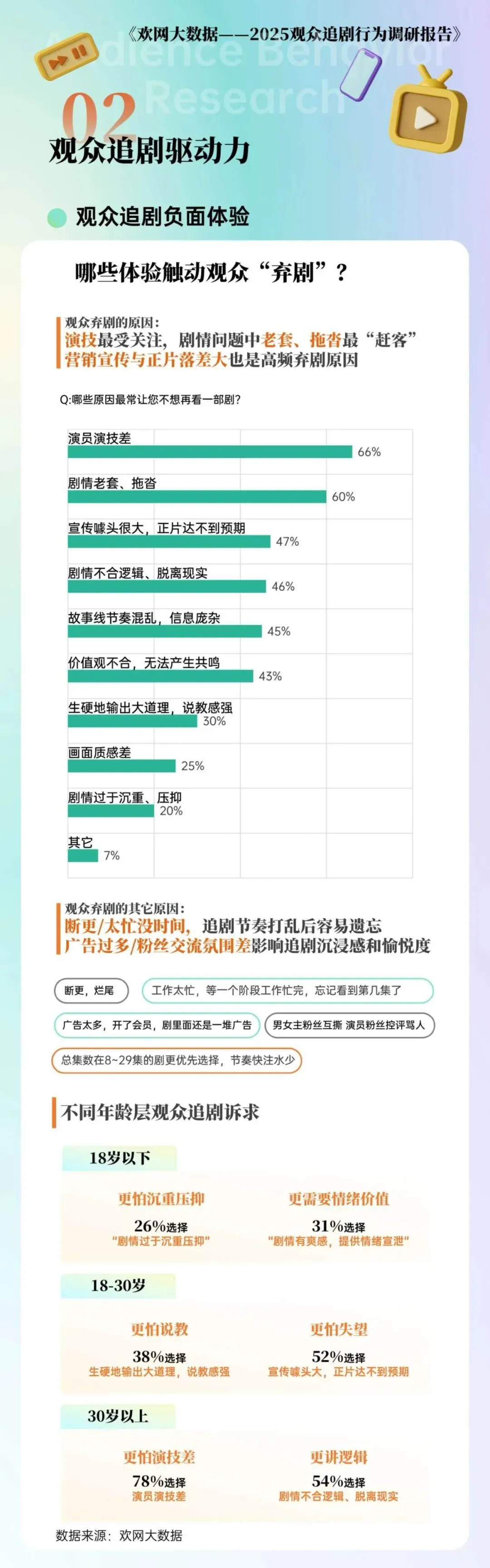 与之相对的,是观众弃剧的核心雷区。66% 的观众会因为演员演技差直接弃剧,60% 的观众无法忍受剧情老套拖沓,宣传噱头与正片落差过大、剧情不合逻辑脱离现实、故事线节奏混乱,也都是高频的弃剧原因。不同年龄层的观众,有着完全不同的追剧雷点。18 岁以下的观众最怕剧情过于沉重压抑,更看重剧集带来的情绪宣泄价值。18 到 30 岁的观众,最反感生硬的说教感,也对宣传货不对板的容忍度极低。30 岁以上的观众,对演员演技差的容忍度几乎为零,78% 的该群体观众会因为演技弃剧,同时对剧情逻辑的严谨性有着更高的要求。