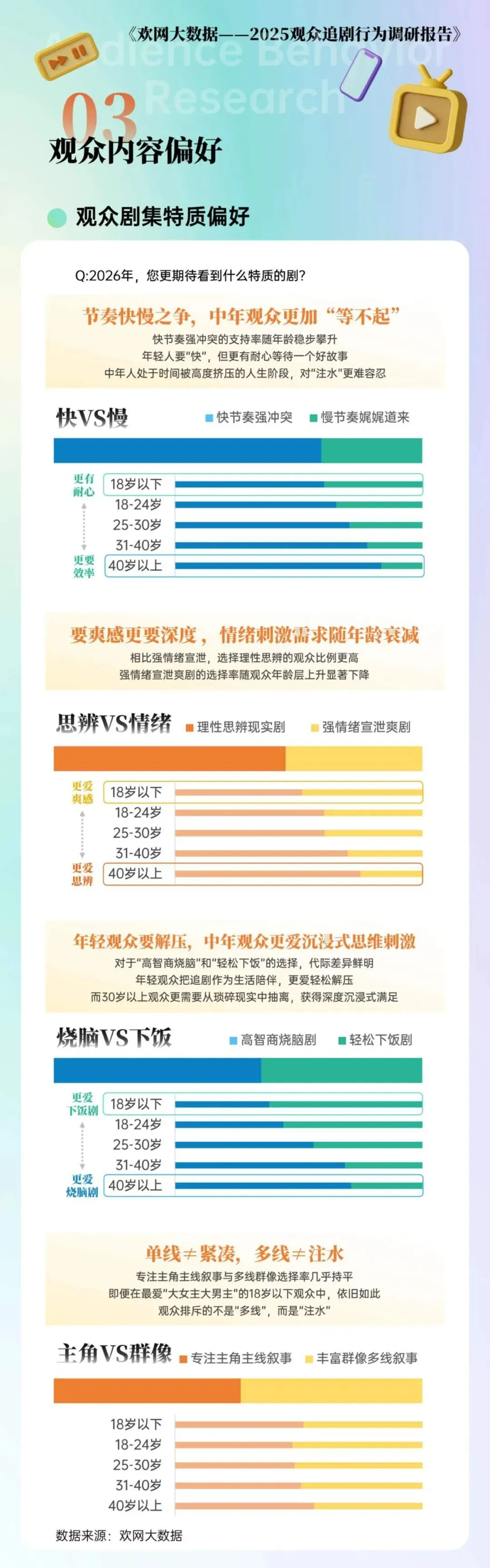 剧集市场的全民爆款时代,已经成为过去,分众化成为 2025 年最鲜明的特征。25 岁以下的观众更偏爱言情、青春校园类题材,25 岁以上的观众更喜欢悬疑、武侠题材,30 岁以上的观众则对历史正剧有着更高的偏好度。角色设定上,清醒型角色以 63% 的选择率成为观众最期待的角色类型,大女主大男主的设定依旧保持着 60% 的高选择率,嘴替型、美强惨等角色类型,也都有着稳定的受众群体。随着年龄的上升,观众对角色复杂性的要求持续提高,18 岁以下观众对大女主大男主的选择率达到 74%,40 岁以上观众的这一数据降至 46%,而对灰度型角色的认可度,从 18% 攀升至 32%。