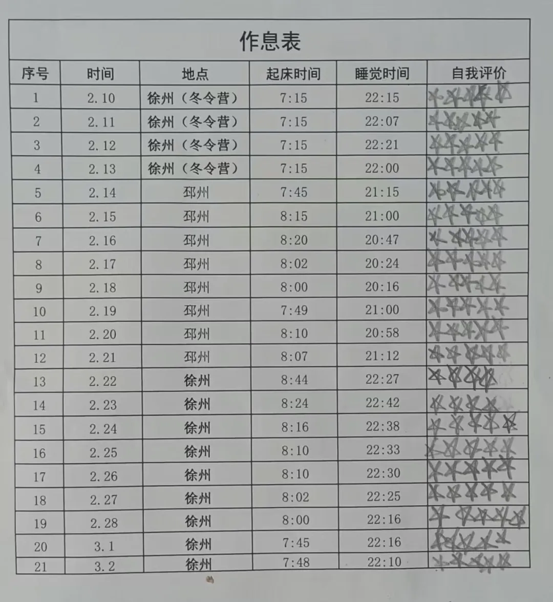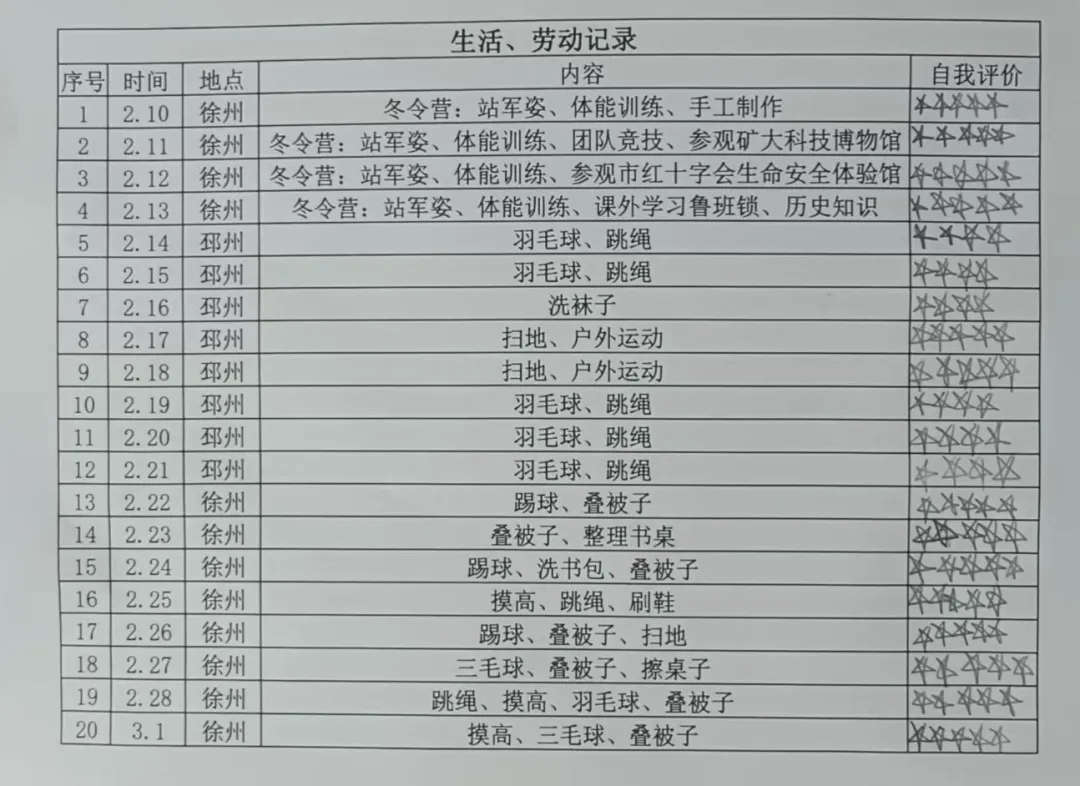 1、作息自律:对比冬令营期间的作息情况,准确记录春节期间每日起床、睡觉、活动的时间,根据实际睡眠时间及时督促,养成规律作息习惯。针对假期走亲访友、节庆活动多,易出现作息紊乱、饮食不规律等特殊情况,坚持“鼓励为主、提醒为辅”的原则,实行弹性作息的同时,明确作息时间段底线,最大限度降低假期对日常作息的负面影响。