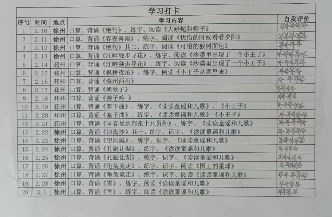 能够坚持每天学习,并保持一定时间的独立学习(无家长陪伴),一百以内口算每天一页基本没有错误,主动说出“喜欢任务完成后打勾的感觉”;不足之处:阅读量不够,还需加强。