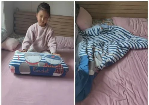目前诸如洗袜子、擦桌子、叠被子、梳头发、刷鞋、洗澡等均能独立完成,个人自理能力实现一定程度提升。假期中平均睡眠时间为21:47分,较放假前普遍22:30分提前了43分钟左右,时间观念得到一定程度增强;不足之处:做事效率上还有进步空间。