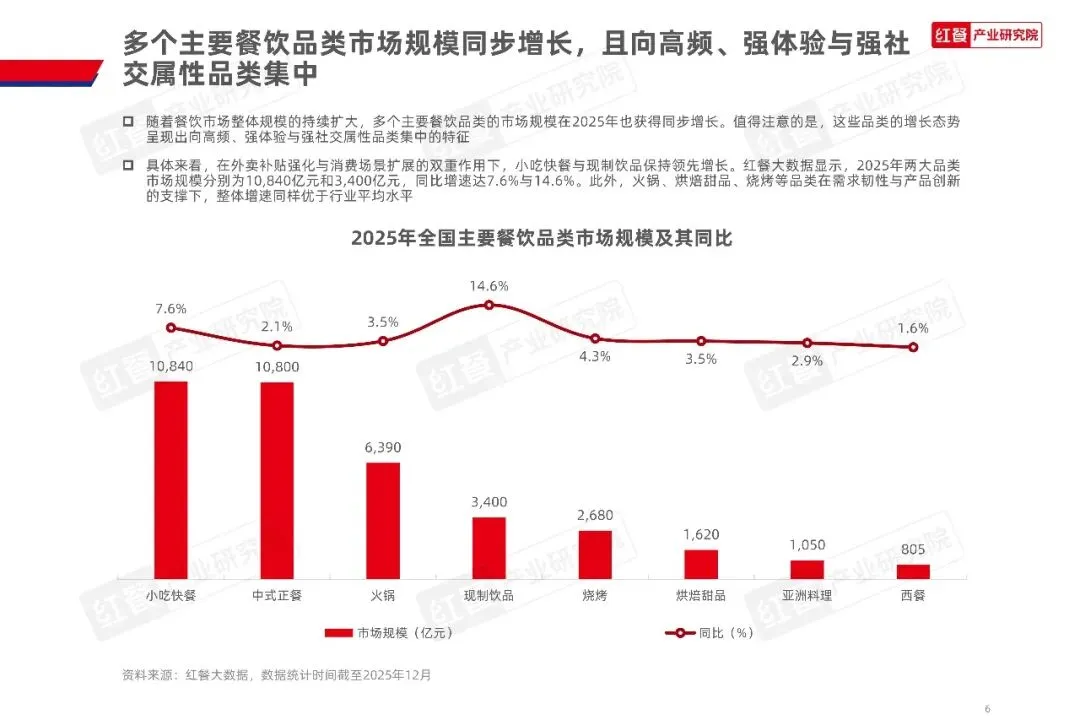 2025年,随着宏观经济稳步回暖、行业监管与政策引导持续深化,推动动餐饮产业链上、中、下游相关企业持续推进产品与模式创新,行业整体延续增长态势据国家统计局数据,2025年全国餐饮收入达5.8万亿元,同比增长3.2%其中,限额以上单位餐饮收入为1.63万亿元,同比增长2.0%。整体来看,餐饮市场规模持续扩大,但增速明显放爱,行业发展逐步由扩张动转向以效率与质量为导向的理性阶段
