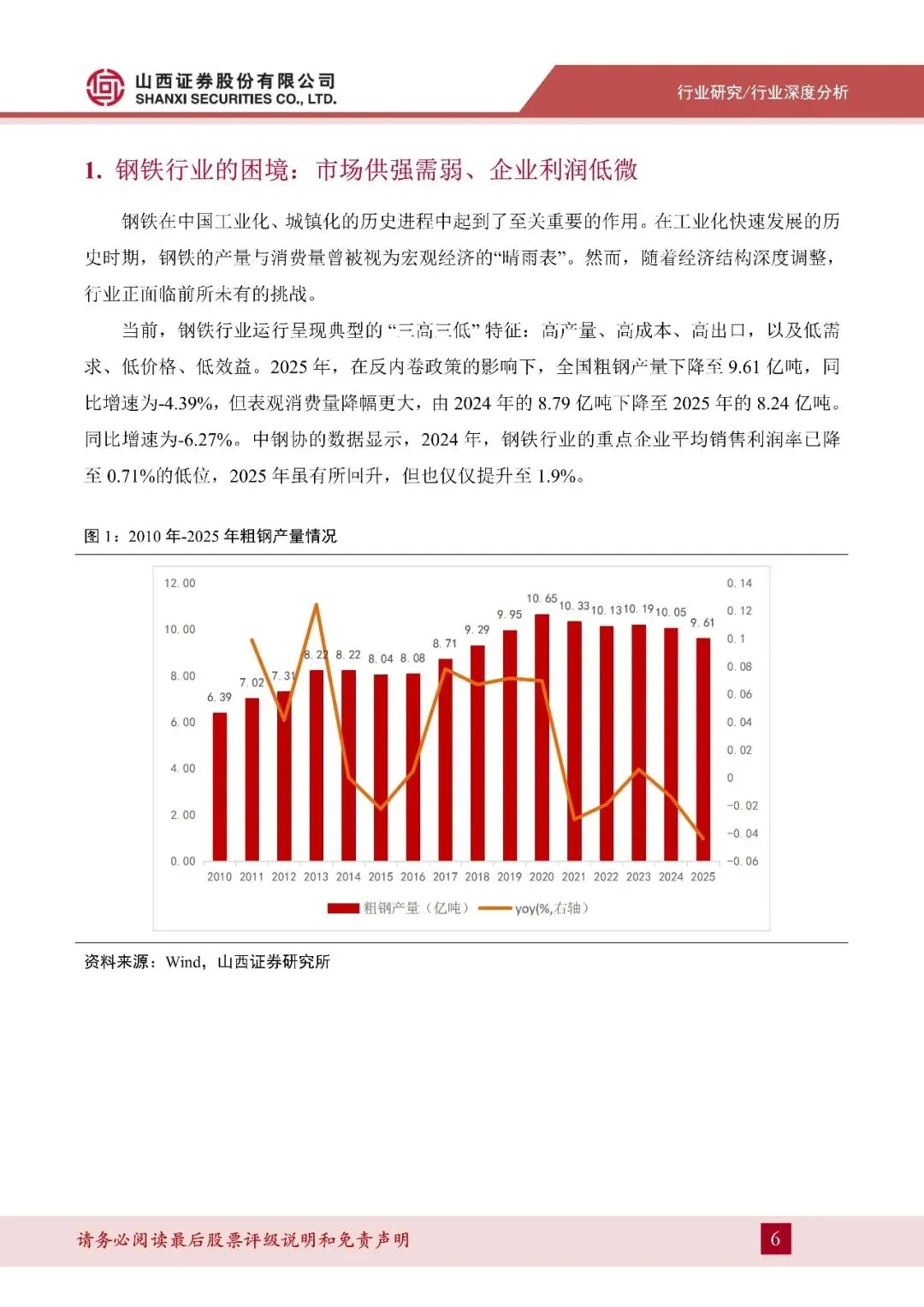 行业核心矛盾凸显:需求趋势性下滑,供给调整刚性。钢铁行业正深陷“三高三低”(高产量、高成本、高出口;低需求、低价格、低效益)的困境,2024 年,行业重点企业平均销售利润率已降至 0.71%的历史低位。