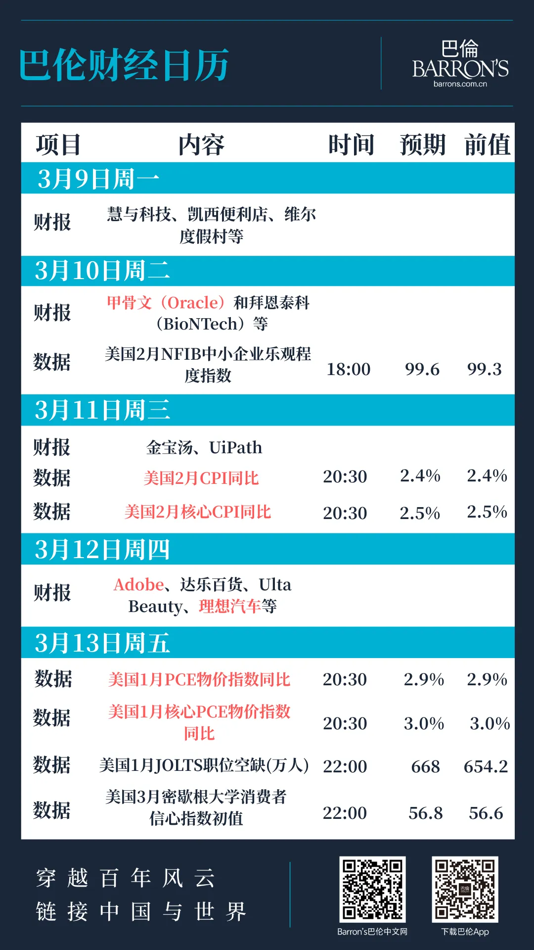 本周,美国2月CPI数据和1月PCE物价指数将分别于周三和周五发布。财报季已进入尾声,但甲骨文、慧与科技等重要公司仍将发布业绩。