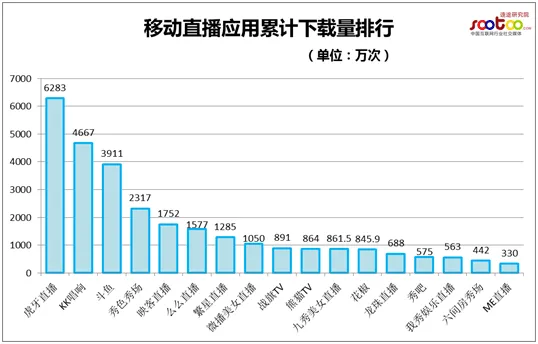 移动直播应用累计下载量排行 虎牙、KK、斗鱼稳居前三