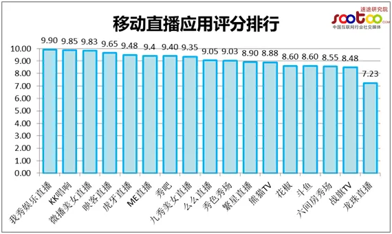 整体上,移动直播类应用的评分比普遍较高,除了龙珠直播7.23分以外,其余的都在8分以上,而这其中有10款软件得分都超过了9分。细看榜单,下载量增长靠前的几家游戏直播应用纷纷让位,虎牙直播排在了第五、熊猫TV排在第十二、斗鱼排在了第十四、战旗第十六。美女直播软件我秀、KK唱响、微播美女直播纷纷上位,跻身前三。平民直播平台映客直播和ME直播分别以9.65,9.4的得分排在第四、六位。可见和游戏直播相比,秀场直播和平民直播类软件,好评度更高,更受用户欢迎。
