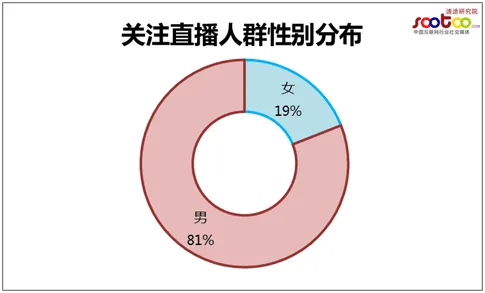 纵观关注直播人群的性别分布中,男性群体占比81%,女性占比仅19%。这也与网络直播内容以游戏和美女为主有关,女性更多的扮演了直播内容的生产者,而消费者的角色更多的由男性来扮演。