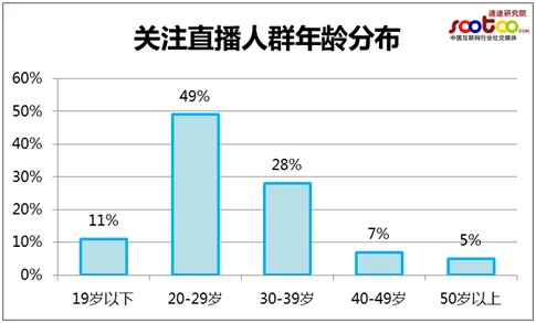 从年龄分布来看,关注直播的人群以年轻人群体为主,仅20-29岁之间的用户群体占比近半,占到了49%,19岁以下群体占比11%,30-39岁群体占比28%,40-49岁以及50岁以上的人群分别占7%和5%。