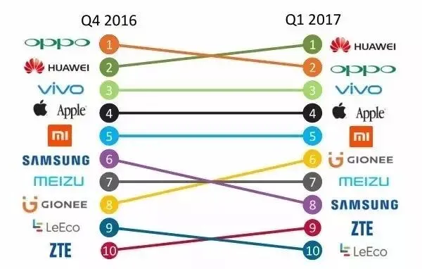 在2017年第一季度,前三名制造商继续领跑中国手机市场,且他们的出货量首次超过了50%,去年同期华为vivoOPPO三个品牌的总出货量占42%。小米原本位列第三,但此后跌至苹果之后,排名第五,在2017年第一季度出货量仅仅超过900万台。”