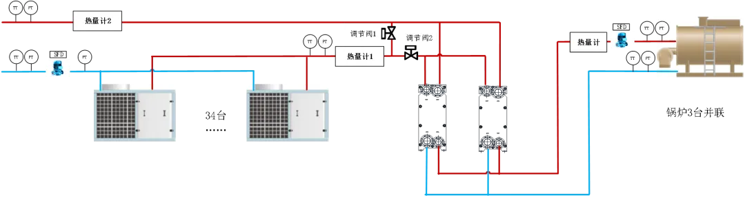 串联模式系统阻力增加0.12兆帕左右,并联模式系统阻力小于串联模式,但须考虑压力平衡点,经过锅炉板式换热器换热的回水压力需与热泵机组入口压力相当,防止出现热泵压力不够,无法满足热泵流量。