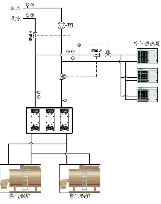 从用户回来的低温水经过循环泵加压后分为两部分,一部分低温水输送给空气源热泵系统,加热后变为中温水输送到供水母管;另一部分低温水经过板式换热器与燃气锅炉输送的高温水进行换热变为中温水。两部分中温水在供水母管混合后输送到热用户,如图4-11所示。