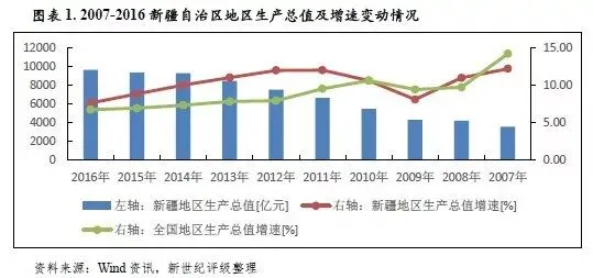 经济实力:依托自身资源禀赋,同时受益于国家持续大力度的政策支持,近年来新疆经济实力持续提升,经济增速总体高于全国平均水平;但由于处于经济增速换挡期、结构调整阵痛期及前期刺激政策消化期的“三期叠加”特殊阶段,2016年全区经济增速有所下滑,目前新疆与全国其他省市相比其经济体量仍相对较小。2016年,新疆实现地区生产总值0.96万亿元,在全国31个省市中仍排名第26位;按可比价格计算,同比增长7.6%,高于全国水平0.9个百分点,但增速较上年下滑1.2个百分点。受产业结构调整、国家化解落后产能、新疆暂缓核准火电项目以及市场预期等诸多因素影响,2016年新疆工业、基础设施等投资明显回落,房地产开发投资增速降幅进一步扩大,作为新疆经济增长主要拉动力的投资增长乏力。当年全区完成固定资产投资9983.86亿元,增速较2015年下降17.0个百分点至-6.9%。未来随着丝绸之路经济带核心区建设的推进,新疆区域经济发展前景持续向好。