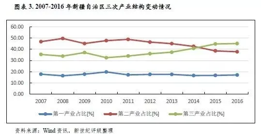 从三次产业结构看,新疆第三产业占比于2015年首次超越第二产业,2016年全区产业结构进一步优化。当年,全区实现第一产业增加值1648.97亿元,同比增长5.8%;第二产业增加值3585.22亿元,同比增长5.9%;第三产业增加值4383.04亿元,同比增长9.7%。同年,全区三次产业增加值构成由2015年的16.7:38.2:45.1调整为17.1:37.3:45.6,三产比重进一步提高0.5个百分点,其对经济增长的贡献率较2015年上升约3个百分点至58.9%。