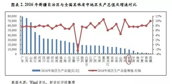 2016年,新疆经济实力继续提升,经济增速持续高于全国平均水平;但由于处于经济增速换挡期、结构调整阵痛期及前期刺激政策消化期的“三期叠加”特殊阶段,全区经济增速有所下滑,目前新疆与全国其他省市相比其经济体量仍相对较小。作为我国少数民族自治区之一以及丝绸之路经济带核心区,新疆具有特殊且重要的政治地位和区位战略地位,能够持续享有国家大力度的政策和资金支持。未来随着“一带一路”战略的持续推行实施,新疆区域经济发展前景持续向好。