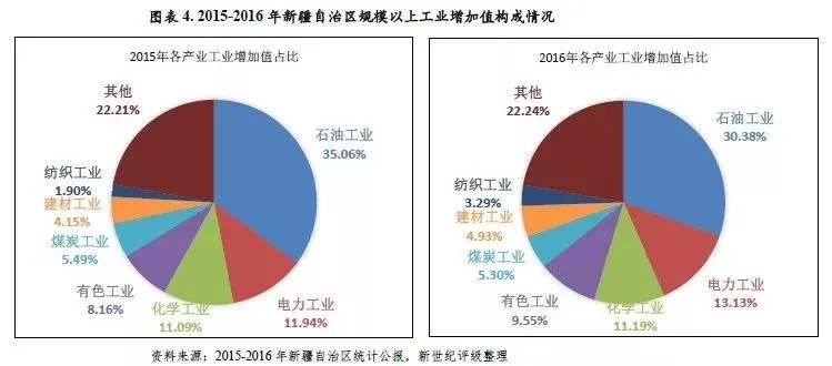 新疆矿产资源丰富,呈种类全、储量大等特征。截至2016年末,全区发现的矿产种类达142种,占全国已发现矿种的82.56%;查明有资源储量的98种矿种中,储量居全国首位、前五位和前十位的矿种数量分别达13种、55种和77种。据全国第二次油气资源评价,新疆石油预测资源量230亿吨,占全国陆上石油资源量的30%;天然气预测资源量16万亿立方米,占全国陆上天然气资源量的34%;煤炭预测储量2.19万亿吨,占全国预测储量的40%。依托资源禀赋优势,新疆支柱产业以资源类产业为主,2016年石油、化工、电力、有色、煤炭、建材等产业分别实现工业增加值741.44亿元、273.02亿元、320.46亿元、233.18亿元、129.37亿元和120.31亿元,合计占当年全区规上工业增加值的74.47%。目前,新疆已拥有新疆有色、新疆能源、中泰化学、新疆投资等具有较强竞争力的能源类行业企业。此外,根据《中国制造2025新疆行动方案》,纺织已被确定为新疆未来制造业发展的重点领域之一,计划到2020年将纺织业打造成为超千亿的制造业产业集群。《2017年新疆维吾尔自治区政府工作报告》明确提出要大力发展纺织服装,2017年力争完成纺织服装产业投资600亿元。依托棉花种植、加工优势以及政策支持,2016年全区纺织工业实现增加值80.40亿元,同比增速较上年显著提升41.4个百分点至47.1%。