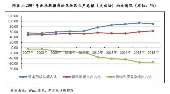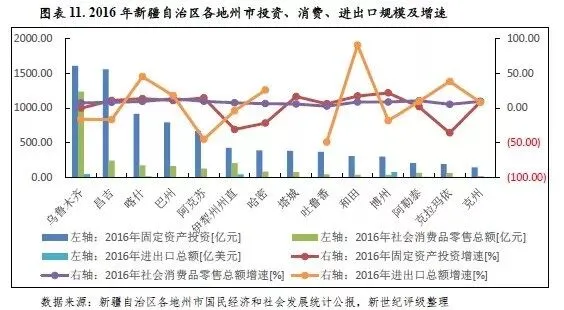 从经济增长动力看,2016年投资在新疆各地州市经济增长方面仍占主导地位,但各地州市投资增速差异明显,部分地区投资出现负增长;各地州市消费则总体呈现平稳增长态势;进出口对经济增长的拉动力则总体继续表现乏力。从区域结构看,乌鲁木齐市投资、消费规模在全区仍保持绝对领先地位,2016年其消费增速高于投资增速,消费对该市经济增长的拉动作用有所增强。。