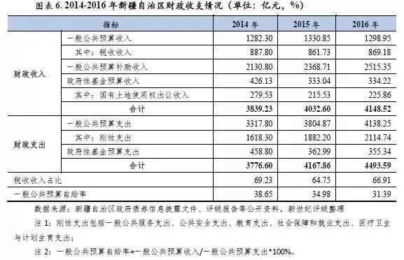 新疆一般公共预算收入规模在全国处于较低水平,且近三年增速持续下滑,并于2016年首次转为负增长。2016年,新疆完成一般公共预算收入1298.95亿元,在全国31个省市中仍排名第24位,增速较上年下降6.2个百分点至-2.4%,主要系其传统支柱产业石油、化工、煤炭等处于周期性产能过剩阶段而景气度低迷、“营改增”政策推行使得全区税收收入增长低速以及当年新疆扩增18项行政事业性免征范围使得非税收收入减收39.35亿元等多重因素叠加所致。从一般公共预算收入构成看,新疆一般公共预算收入以税收收入为主,但近年税收占比有所波动,2016年为66.91%,较上年上升2.17个百分点。此外,目前新疆单位地区生产总值形成财政收入的能力相对较好,2016年全区一般公共预算收入占地区生产总值的比重为13.51%,高于全国平均水平(11.64%)1.87个百分点,居全国第6位。虽然近年新疆税收拉动一般公共预算收入增长的动力趋弱,但得益于其特殊的政治和区位战略地位,新疆能够持续获得中央较大规模的财政补助支持,2016年全区获得一般公共预算上级补助收入2515.35亿元,同比增长6.19%;其中一般性转移支付收入1408.60亿元。上级补助收入为新疆财力提供了有了支撑。从支出结构看,新疆一般公共预算支出主要涉及一般公共服务、公共安全、教育、社会保障和就业、医疗卫生与计划生育、城乡社区、农林水事务、交通运输等领域。2016年,全区完成一般公共预算支出4138.25亿元,其中刚性支出占比较上年进一步上升1.6个百分点至51.1%。全区一般公共预算收入仍无法对刚性支出其形成有效覆盖,且保障倍数较2015年进一步下降至0.61倍。