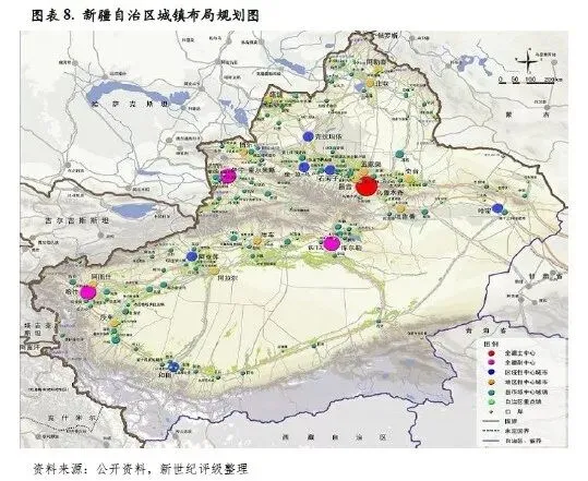 根据《新疆城镇体系规划(2014—2030)》,新疆规划把乌鲁木齐都市圈打造成为全国重要的城镇群,把乌鲁木齐市建设成为国家对外开放重要的国际城市;把乌昌都市区、喀什、伊宁-霍尔果斯、库尔勒、克拉玛依、奎屯-独山子-乌苏、哈密、阿克苏等培育成为新疆重要增长极。城镇空间布局方面,新疆规划构筑“一圈、多群、三轴、一带”的城镇空间发展总体结构和“一主三副、多心多点”的中心城市布局。“一圈”即把乌鲁木齐都市圈建设成为我国面向中亚、西亚、南亚地区的国际性商贸中心、文化交流中心和区域联络中心,我国西北地区重要的能源综合利用基地、新型工业基地、旅游集散中心,新疆区域经济和科技创新中心;“多群”即构筑喀什-阿图什、伊犁河谷、库尔勒、奎独乌、阿克苏、库车、麦盖提-莎车-泽普-叶城、和田-墨玉-洛浦、阿勒泰-北屯、博乐-阿拉山口-精河、塔额盆地等绿洲城镇组群,建设成为新型城镇化、新型工业化和农牧业现代化的重要载体;“三轴”即以国家级、区域性交通走廊为纽带,以重要交通枢纽节点为支撑,引导人口和产业向走廊地区的主要城镇聚集,规划形成兰新线城镇发展轴、南疆铁路城镇发展轴、喀什—和田新兴城镇发展轴;以点带群,由点及线,加强绿洲之间的经济社会联系;“一带”即大力扶持边境城镇(团场、口岸)发展,打造战略屏障和对外开放前沿。以重点口岸为引领,推进边境口岸及其腹地城镇发展,打造对外开放门户。加快边境地区中心城市产业发展,提高辐射带动能力;完善边境县市、团场公共服务设施,加强基础设施安全保障能力,发展特色农牧业和特色旅游业。“一主三副、多心多点”即以乌鲁木齐为主中心,以喀什、伊宁-霍尔果斯和库尔勒为副中心,同时发展建设克拉玛依、阿克苏、哈密、石河子、奎独乌、和田、昌吉、博乐、塔城、吐鲁番、阿图什、阿勒泰、北屯、库车、莎车、奇台、阿拉尔和五家渠等其他18个绿洲中心城市。